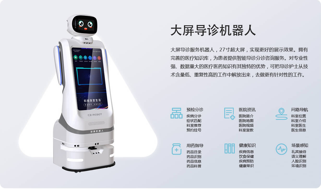 患者可以語音問詢院內業務辦理方法、生活信息、業務對應科室、政策信息等常見問題,支持人臉識別、迎賓接待等特色功能,可根據不同患者類型進行心理安撫。