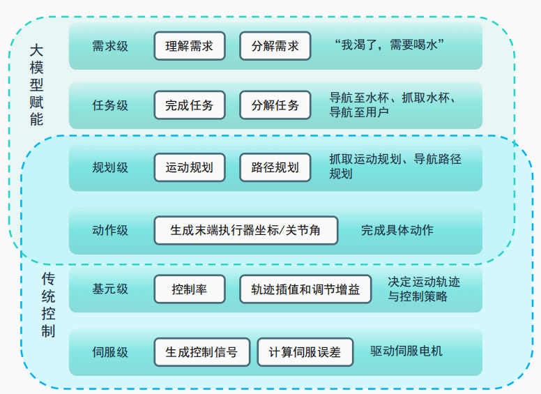 機(jī)器人大腦提高人形機(jī)器人的人-機(jī)-環(huán)境共融交互能力,支撐全場景落地應(yīng)用;機(jī)器人小腦提升人形機(jī)器人非 結(jié)構(gòu)化環(huán)境下全身協(xié)調(diào)魯棒移動、靈巧操作及人機(jī)交互能力