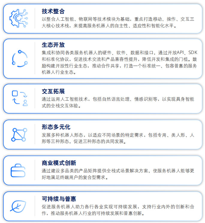 開放性的全棧式智能服務(wù)機(jī)器人生態(tài)是一個(gè)技術(shù)框架和商業(yè)模式的創(chuàng)新綜合體,旨在通過以AI為 核心的多技術(shù)棧和創(chuàng)新的商業(yè)模式,建立開放普 惠的行業(yè)生態(tài),實(shí)現(xiàn)服務(wù)機(jī)器人與一切可能的交 互對象(包括人、環(huán)境、其他機(jī)器人和軟硬件系 統(tǒng))之間的智能交互與萬物互聯(lián),形成一個(gè)通用 的全棧式智能機(jī)器人體系。該生態(tài)的核心理念在 于開放性和通用性,通過構(gòu)建一個(gè)多面互通、無縫銜接的智能服務(wù)機(jī)器人生態(tài),來實(shí)現(xiàn)服務(wù)機(jī)器人在多樣化應(yīng)用場景中的深度融合和廣泛應(yīng)用。