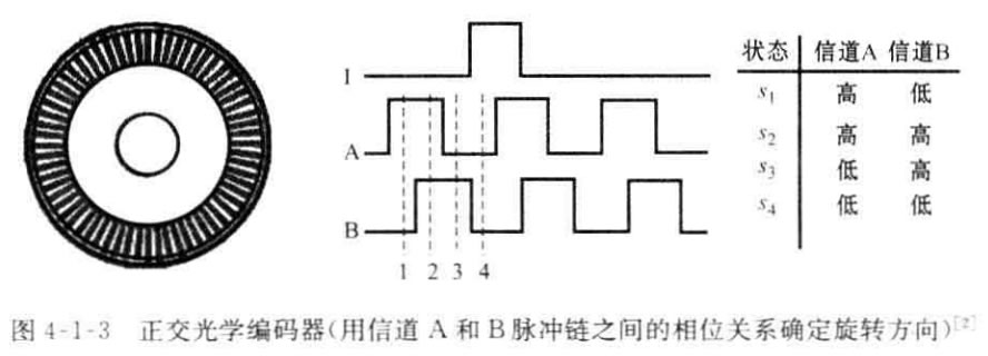 以圖4-1-2為例說明光學編碼器的結構。光學編碼器由發光元件、屏蔽光的固 定光柵、與轉軸一起旋轉的帶光柵的轉盤和固定的光敏元件組成。發光元件和光敏 元件安放在碼盤的兩側,當轉盤轉動時,根據固定的和運動的光柵的排列,光敏元件 接收的光通量會發生變化。光敏元件輸出的波形經過整形后形成脈沖,根據脈沖計 數,可以得到固定在碼盤上的轉軸的角位移。在測量中,Z后得到的光強信號用閾 值變換成離散的方波,在亮和暗的狀態之間作選擇。分辨率以每轉周期數(CPR)度量。Z小的角分辨率可以容易地從編碼器的CPR 額定值計算出。典型的編碼 器可擁有2000 CPR, 而光學編碼器工業可容易地制造出具有10000 CPR 的 編 碼 器。當然,根據所需的帶寬,Z關鍵的是編碼器需要足夠快,以計算期望的軸轉速。