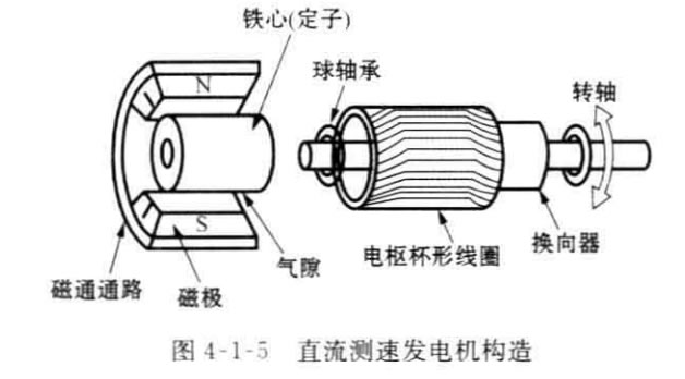 如圖4-1-5所示,直流測速發電機的定子是永久磁鐵,轉子是線圈繞組。它的 原理和永久磁鐵的直流發電機相同,轉子產生的電壓通過換向器和電刷以直流電 壓的形式輸出,可以測量0~10000r/min 量J的旋轉速度,線性度為0 . 1 % 。 此 外,停機時不易產生殘留電壓,因此,它Z適宜作速度傳感器。但是電刷部分是機械接觸,需要注意維修,另外,換向器在切換時產生脈動電壓,使測量精度降低。因 此,現在亦有用無刷直流測速發電機。