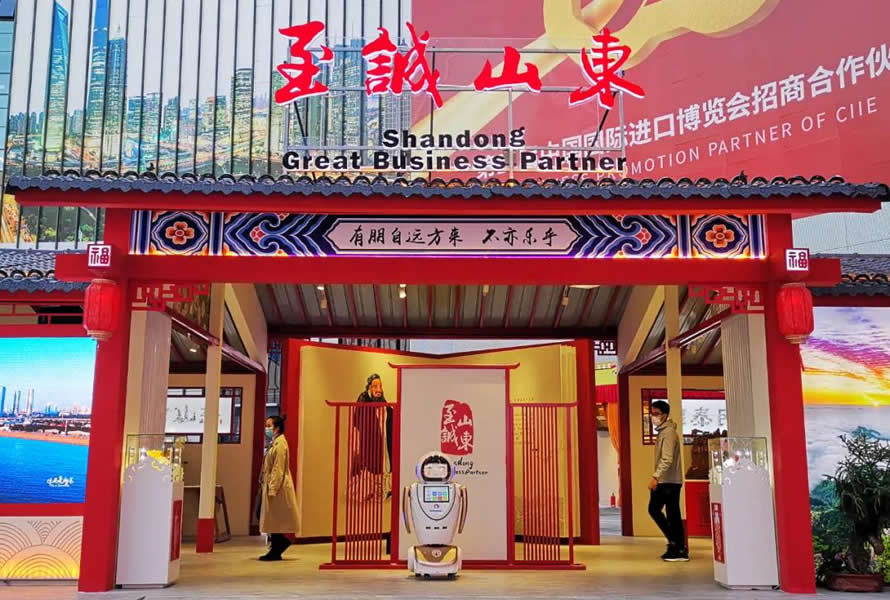2020年11月5日,山東省委副書記、省長李干杰等L導在進博會巡展時,智能迎賓講解機器人“創創”在廣場“至誠山東”展區熱情接待了李干杰省長一行。