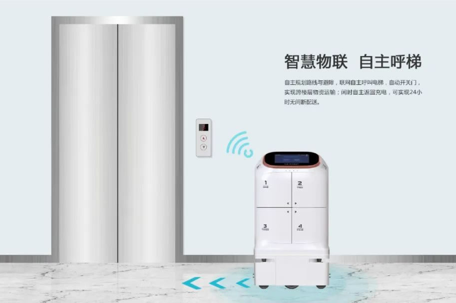 配送服務是機器人核心的功能,創澤智能配送機器人針對配送全流程進行體驗優化,真正實現了全程無接觸配送。配備艙體有超大的儲物空間,聯網自主呼叫電梯,實現跨樓層物資運輸;在G峰時段支持多機協作,放取貨品后自動關閉艙門,到達指定房間后,通過住房間內的門鈴、電話、小程序等方式通知客人取貨,在配送途中遇到客人,會貼心的送去問候。
