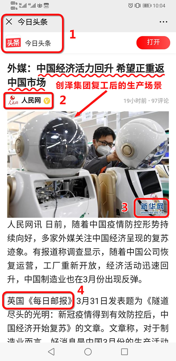 英國《每日郵報》3月31日發表題為《隧道盡頭的光明:新G疫情得到有效防控后,中國經濟開始復蘇》的文章。文章稱,對于制造業而言,好消息是中國3月份的生產活動和新訂單升至50%以上。同時,服務業也有所反彈。