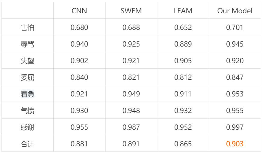 圖 5 給出了在線情感安撫的三個示例,分別對應上述的三種不同層面的回復機制。 表 2:需要安撫的情感分類效果對比