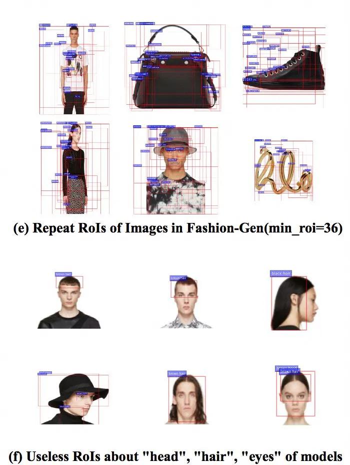 電商圖像產品單一,背景簡單提取 ROI 很少,如圖 1(c)。統計來看,通用L域 MsCoCo 數據,每張圖像可以提取 19.8 個 ROI,但是電商只能提取 6.4 個 ROI。當然我們可以強制提取小的 ROI,比如 ViLBERT 要求在 10~36 個,VLBERT 要求 100 個。但是當設定小提取的 ROI 后,又提取了太多了重復的 ROI,可以看圖 1(e)。