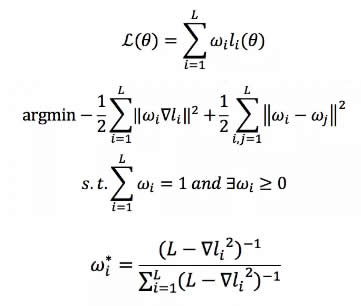 這是一個多任務學習問題,如何平衡這些任務的學習權重呢?另外,還有一個問題,目前很多實驗指出 BERT 中 NSP 的效果并不一定非常有效,對終的結果的影響不是特別明朗。但是對于圖文匹配來說,Text and Image Alignment 這個 loss 是至關重要的。那么如何平衡這幾個任務的學習呢?這里我們提出 adaptive loss 算法,我們將學習任務的權重看做是一個新的優化問題,如圖 3 所示。FashionBERT 的 loss 是整體 loss 的加和,由于只有三個任務,其實我們可以直接得到任務權重 W 的解析解(具體的求解過程可以參考我們論文,這里不再贅述)。