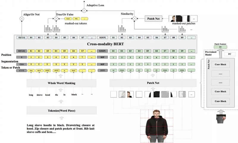 采用預訓練的 BERT 為網絡,這樣語言模型天然包含在 FashionBERT 中。模型可以更加關注圖文匹配融合。