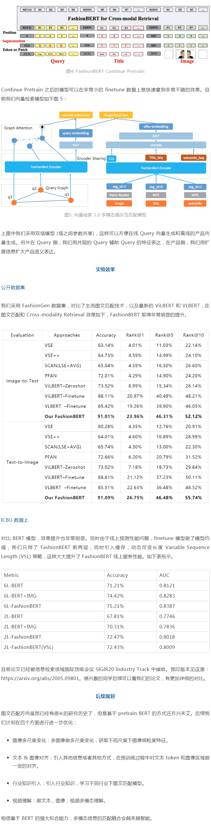 目前 FashionBERT 已經開始在 Alibaba 搜索多模態向量檢索上應用,對于搜索多模態向量檢索來說,匹配任務可以看成是一個文文圖匹配任務,即 User Query (Text)-Product Title (Text) - Product Image (Image) 三元匹配關系。FashionBERT 從上面的模型可以看到是一個基礎的圖文匹配模型,因此我們做了 Continue Pretrain 工作,同時加入 Query,Title,Image Segment 區分,如圖四所示。和 FashionBERT 大的區別在于我們引入三個 segment 類型,“Q”,“T”,“I” 分別代表 Query,Title,Image。