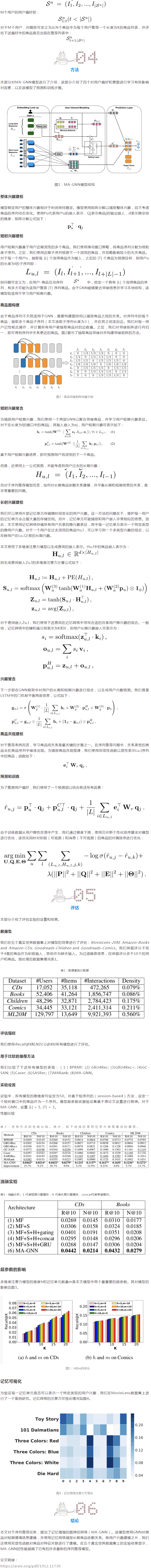用戶-商品交互的時(shí)間順序可以揭示出推薦系統(tǒng)中用戶行為隨時(shí)間演進(jìn)的序列性特征。用戶與之交互的商品可能受到用戶曾經(jīng)接觸的商品的影響。但是,用戶和商品數(shù)量的大量增加,使得序列推薦系統(tǒng)仍然面臨很多重要問題:(1)對(duì)短時(shí)用戶興趣建模的困難;(2)捕捉用戶長期興趣的困難;(3)對(duì)商品共現(xiàn)模式的建模效率較低。為了應(yīng)對(duì)這些挑戰(zhàn),本文提出了一個(gè)記憶增強(qiáng)的圖神經(jīng)網(wǎng)絡(luò)(memory augmented graph neural network, MA-GNN),以捕捉用戶的長期和短期興趣。