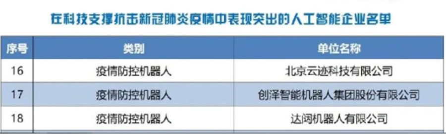 工業(yè)和信息化部科技司 關(guān)于公布在科技支撐抗擊新G肺炎疫情中表現(xiàn) 突出的人工智能企業(yè)名單的通知 工科函﹝2020﹞516號(hào) 各有關(guān)單位 : 總書記強(qiáng)調(diào),戰(zhàn)勝疫病離不開科技支撐,人類同疾病較量有力的武器就是科學(xué)技術(shù)。為貫徹落實(shí)黨國(guó)務(wù)院決策部署,推動(dòng)人工智能技術(shù)積J賦能防疫抗疫任務(wù),2020年2月4日,我司向社會(huì)發(fā)布了《充分發(fā)揮人工智能賦能效用 協(xié)力抗擊新G疫情的倡議書》。廣大人工智能企業(yè)積J響應(yīng)、主動(dòng)作為、攻堅(jiān)克難、開拓創(chuàng)新,推動(dòng)肺炎CT影像輔助診斷系統(tǒng)、疫情防控機(jī)器人、智能測(cè)溫系統(tǒng)、疫情防控外呼機(jī)器人等智能技術(shù)在防疫抗疫中發(fā)揮了積J作用,取得了良好社會(huì)效果,有效踐行了企業(yè)社會(huì)責(zé)任。 在人工智能創(chuàng)新應(yīng)用先導(dǎo)區(qū)和有關(guān)專業(yè)機(jī)構(gòu)支持下,我們對(duì)在科技支撐抗擊新G肺炎疫情中表現(xiàn)突出的人工智能企業(yè)進(jìn)行了追蹤,現(xiàn)將表現(xiàn)突出的企業(yè)名單予以公布,以示肯定和鼓勵(lì)。 特此通知。 工業(yè)和信息化部科技司2020年6月17日