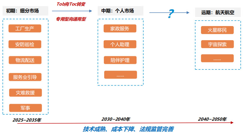 ,由tob轉(zhuǎn)為toc,進(jìn)入家政等市場。更遠(yuǎn)期,人形機(jī)器人有望應(yīng)用于航天航空L域,切合Musk火星移民構(gòu)