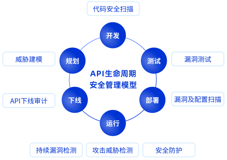 其次,API在整個業務生命周期當中變化非?,API實現邏輯一旦發生變化,很容易引入新的風險。因此,從API全生命周期來考慮API安全,圍繞規劃、開發、測試、部署、運行到下線的每一個環節加強安全建設顯得尤為重要。