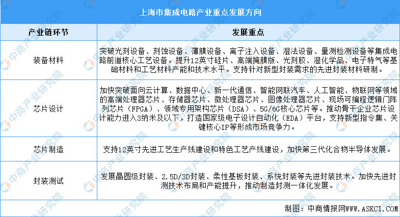 上海市將集成電路產業作為核心先導。到2025年,上海集成電路產業規模實現倍增,將形成國際出色、技術先進、產業鏈完整、配套完備的集成電路產業體系,基本建成具有影響力的集成電路產業創新G地。未來,上海市集成電路產業重點發展方向如下: