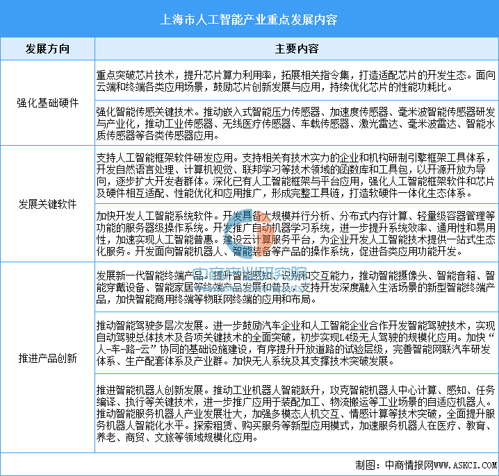 上海市將深入推動(dòng)人工智能算法、算力、數(shù)據(jù)三大要素融合促進(jìn),強(qiáng)化基礎(chǔ)硬件、發(fā)展關(guān)鍵軟件、推進(jìn)產(chǎn)品創(chuàng)新,夯實(shí)人工智能產(chǎn)業(yè)發(fā)展基礎(chǔ),形成產(chǎn)業(yè)生態(tài)的核心優(yōu)勢(shì)。