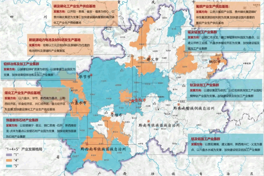 貴州省依托豐富的磷、煤、鋁、錳、金、重晶石、螢石等礦產(chǎn)資源,經(jīng)過多年的發(fā)展,已經(jīng)初步形成了以磷及磷化工、煤及煤化工、鋁及鋁加工、錳及錳加工、黃金、氟鋇化工等為主體的資源型產(chǎn)業(yè)基礎(chǔ),行業(yè)重點(diǎn)龍頭企業(yè)包括貴州磷化集團(tuán)、首鋼水鋼、中鋁集團(tuán)等。在產(chǎn)業(yè)空間布局方面,貴州結(jié)合資源稟賦和產(chǎn)業(yè)基礎(chǔ),圍繞建設(shè)全國重要的資源精深加工基地,努力構(gòu)建“1+4+5”產(chǎn)業(yè)發(fā)展格局。