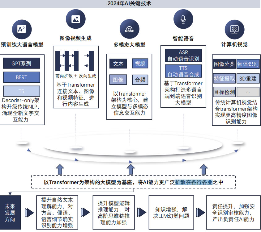 Transformer架構賦能AI在文本圖像視頻生成、文字交互、智能語音 和計算機視覺L域技術能力增強和應用范圍拓寬。未來,AI技術將進一步提升G階邏輯推理、內容安全、知識準確性和語言理解能力
