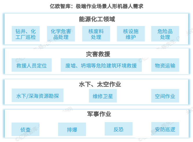 J端作業(yè)場景對人形機(jī)器人有廣泛的需求,人形機(jī)器人可在惡劣環(huán)境下幫助或替代救援人員操作,解決人員短缺及生命安全問題,從而提G救援效 率、減少人員傷亡、提G物資運輸效率等。