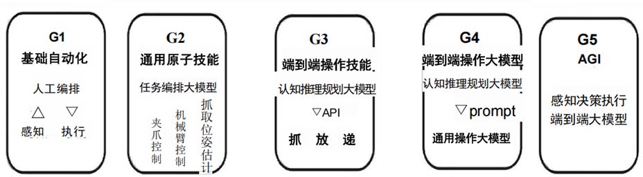 同時,智元還定義了G1 至 G5 的具身智能技術演進路線。G1 主要針對特定場景;G2 面向更多場景任務, 具有一定的泛化能力;G3 從原先的算法驅動轉變為數據驅動;G4 引入了仿真數據和世界模型;G5 致力于 從感知到執行,具備G度的自主性和適應性。目前智元處于G2和G3階段,已在G2路線取得階段性突破, 實現了UniPose、UniGrasp、UniPlug 的通用原子模型,G3 路線上也形成了全流程具身數據方案AIDEA。