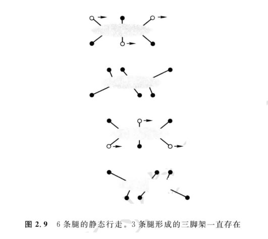 相反,3條腿的動物假定它能保證其重心處在地面接觸的三腳區內,它就能夠展 示靜止、穩定的姿態。如3條腿的凳子所展現那樣,靜止穩定性意味著不需要運動而 保持平衡。在沒有傾覆力時,稍微偏離穩定(比如輕輕推凳子)會被動地予以校正而 趨向穩定的姿態。 但是為了行走,機器人需要能夠抬腿。為了能達到靜態行走,機器人至少要有4 條腿,一次移動一個。而對于6條腿的情況,就有可能設計出一種步態,按此,腿的靜 態穩定三腳區總是與地面接觸(圖2.9)。