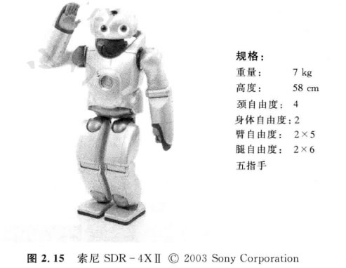 索尼夢想機器人,即SDR-4X Ⅱ模型,如圖2.15所示。這個流行的模型是1997 年開始的研究結(jié)果,它以運動表演和交際娛樂(如跳舞和唱歌)為基本目的。這個具 有38個自由度的機器人,為了聲音的精細(xì)定向、基于圖像的人員識別、單板微型立體 景深圖的重構(gòu)以及有限的語音識別,裝有7個麥克風(fēng)。給定了流媒體和娛樂運動的 目標(biāo),索尼公司花費了巨大的精力設(shè)計了運動的原型應(yīng)用系統(tǒng),它能使他們的工程師 以簡捷的方式編排舞蹈。要注意的是,SDR-4XI 比較小,站立58cm, 重量僅6.5kg。