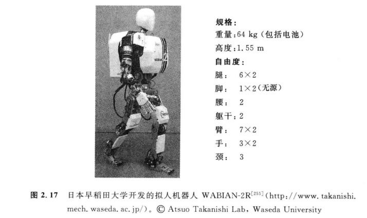 雙腳機器人一個重要的特征是它們具有類似人的外形。它們可以被制造成和人 相近似的尺寸,這使得它們在人機交互的研究中成為出色的運載工具。日本早稻田 大學(xué)制造的WABIAN-2R (圖2.17)正是作這種研究的[255]。WABIAN-2R 被設(shè)計 成能夠模仿人的運動 , 并甚至設(shè)計成能夠像人一樣跳舞 。
