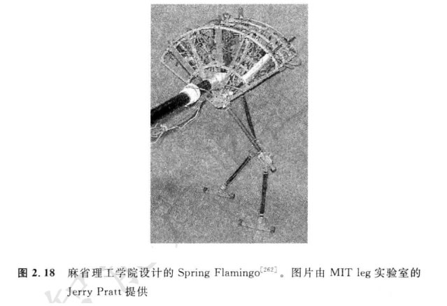 雙腳機器人只能在某些限制內(nèi)靜態(tài)地穩(wěn)定。因此,像P2 和WABIAN-2R 這樣的 機器人即使站著不動,通常也需要連續(xù)地進行伺服平衡校正。而且,各條腿都需要有足 夠的容量以支撐機器人全部重量。在四腿機器人情況下,平衡問題隨各條腿上的負(fù)荷 需求而變得容易解決。雙腿機器人的 一個 出色設(shè)計是麻省理工學(xué)院設(shè)計的Spring Fla- mingo (圖2. 18)。這個機器人與腿激勵器相連,插入了彈簧,實現(xiàn)更有彈性的步態(tài)。通過與限制膝蓋關(guān)節(jié)角度的“膝蓋骨”相結(jié)合,F(xiàn)lamingo 實現(xiàn)了驚人的仿生運動。