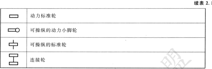 表2.1給出了輪子結構的概貌,按輪子數目排序。表中描述了特殊輪子類型的選擇和機器人底盤上它們的幾何結構這兩個方面。我們注意到,所示的某些輪子結構在移動機器人的應用中很少用到。例如,兩輪自行車裝配,其機動性中等,可控性 差。再像單腿跳躍機,它根本不能靜止地站著。不過,表中提供了在運動機器人設計 中可能用到的許多種類輪子結構的說明。