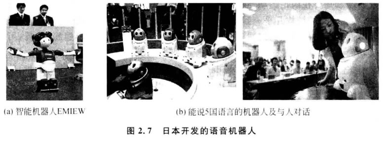日本日立公司也研制了一臺智能機(jī)器人EMIEW, 它的個頭和小孩一樣,依靠輪子移 動,如圖2.7(a)所示。由于身上裝有數(shù)碼相機(jī)和雷達(dá)探測器,它可以自動地躲避障礙物。 同時它的詞匯儲備量達(dá)到100多個,能夠?qū)σ恍┖唵蔚穆曇糁噶钭龀龇磻?yīng),并且還能夠 和人進(jìn)行簡單的對話交流,甚至播報天氣預(yù)報等。第二代 EMIEW2 機(jī)器人可以通過無 線電裝置接收指令,然后毫不費(fèi)力地在辦公室之間來回奔波,為辦公室人員跑腿。它站 立時身高大約為31.5英寸,體重為29磅。它能夠?qū)φ系K物應(yīng)付自如,對人的語音做出 回應(yīng),并且一次充電后即可工作1小時。此外,能說5國語言的機(jī)器人及與人對話的機(jī) 器人也已經(jīng)誕生了,如圖2.7(b) 所示。在我國舉辦的日語演講大賽現(xiàn)場上,參加比賽的 選手以及日語院校的學(xué)生不但與該機(jī)器人進(jìn)行了交流互動,而且該機(jī)器人還獻(xiàn)上了許多 精彩舞蹈和歌曲。