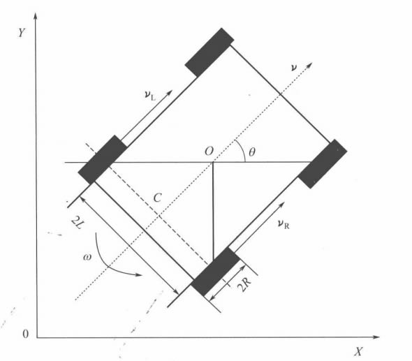 以四輪機器人為例,其中后面兩輪是d立驅動輪,前面兩輪是萬向輪,機器人的運動參數和坐標系