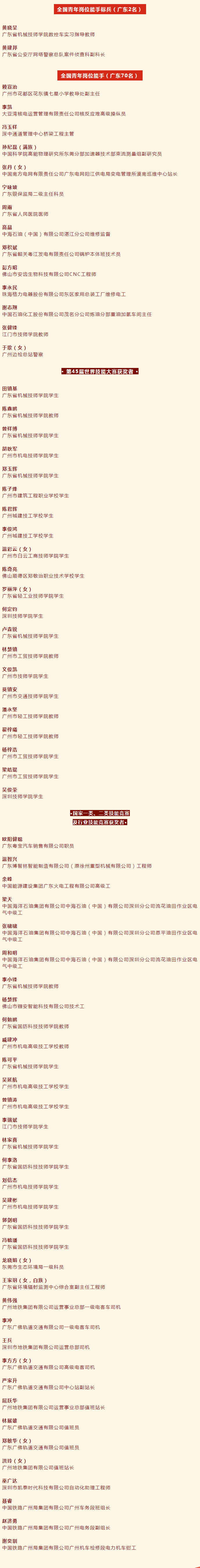 廣東省第20屆全國青年崗位能手名單