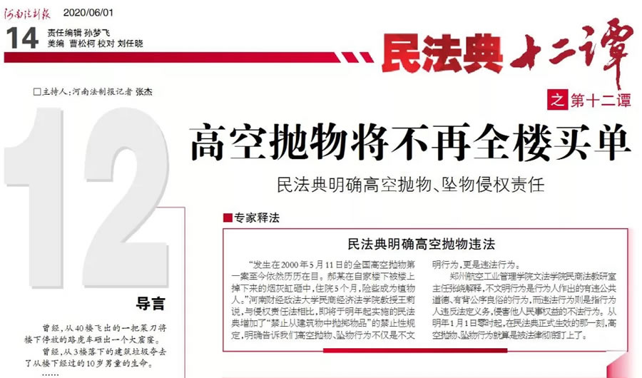 “發生在2000年5月11日的全國G空拋物D一案至今依然歷歷在目。郝某在自家樓下被樓上掉下來的煙灰缸砸中,住院5個月,險些成為植物人。”河南財經政法大學民商經濟法學院教授王莉說,與侵權責任法相比,即將于明年起實施的民法典增加了“禁止從建筑物中拋擲物品”的禁止性規定,明確告訴我們G空拋物、墜物行為不僅是不文明行為,更是違法行為。