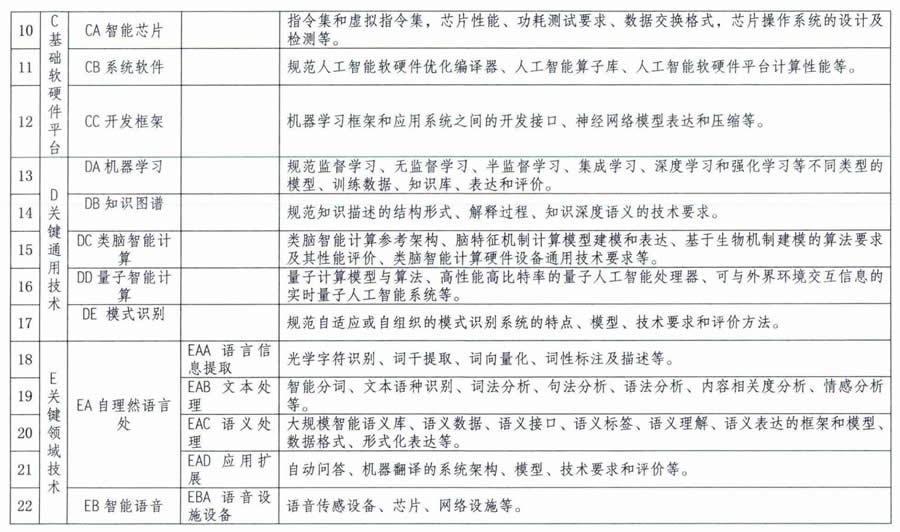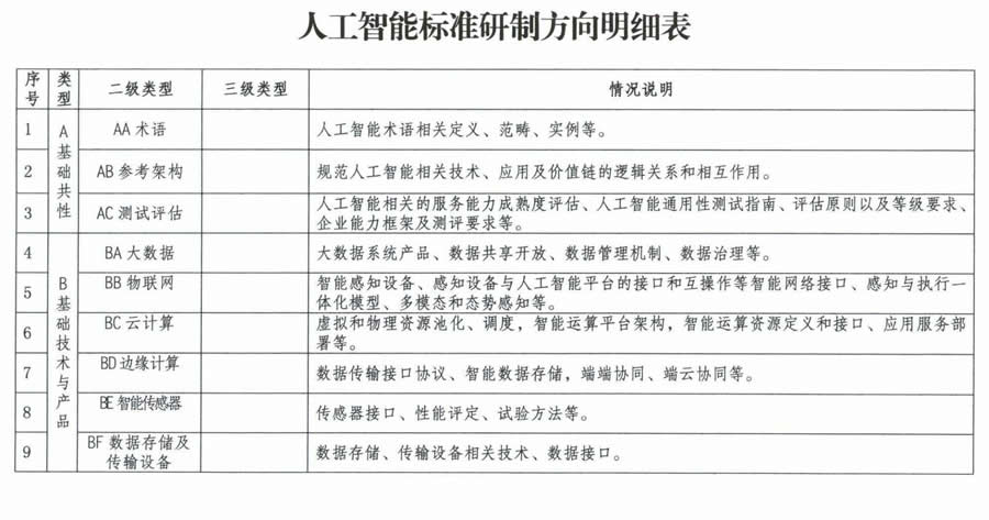 人工智能標(biāo)準(zhǔn)體系框架主要由基礎(chǔ)共性、支撐技術(shù)與產(chǎn) 品、基礎(chǔ)軟硬件平臺(tái)、關(guān)鍵通用技術(shù)、關(guān)鍵L域技術(shù)、產(chǎn)品與 服務(wù)、行業(yè)應(yīng)用、安全/倫理八個(gè)部分組成