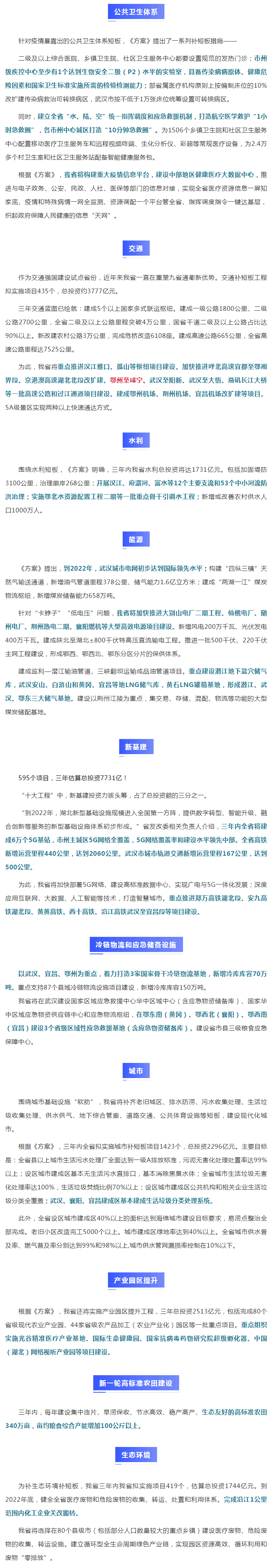 鄂政發〔2020〕19號,用三年時間實施一批打基礎、補短板、強功能、利長遠、惠民生的重大項目達4572個,估算總投資約2.3萬億元