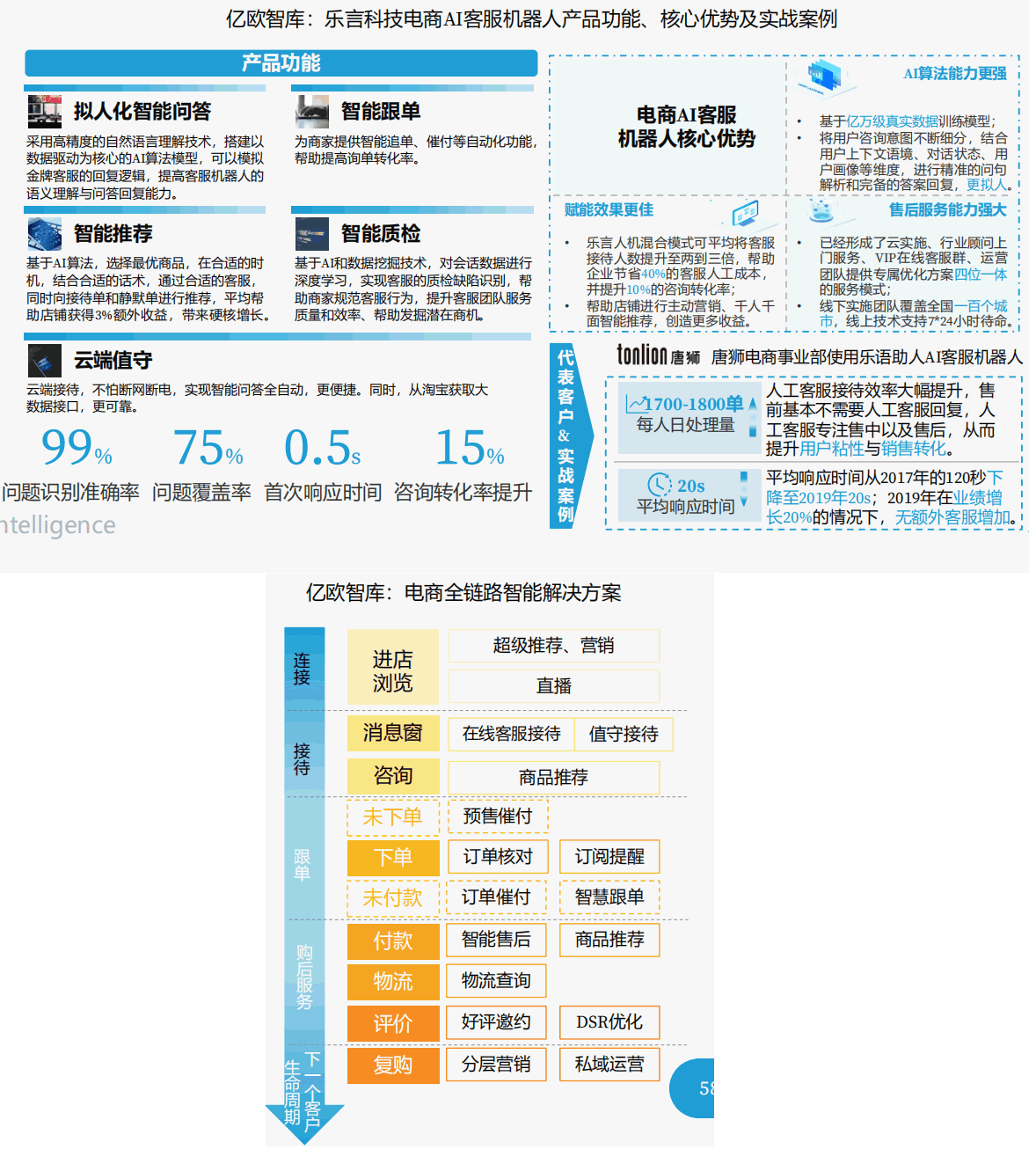 在電商L域,樂言科技自主研發了面向淘寶、天貓等平臺的AI客服機器人“樂語助人” ,具備G準確的語言理解能力,可模擬金牌客 服的回復邏輯,輔助人工客服進行客服咨詢接待、業務問題處理、智能推薦、客情維系等。AI客服機器人全年全天24小時無休,不僅 降低了人工客服團隊營運開支,還大幅提升了客服人均接待效率與營銷轉化率,為電商商家創造了更多利潤。目前,公司已服務近3萬 家電商頭部客戶,如李子柒、唐獅、江南布衣、如涵、以純、透真、恒安集團、達利園等。