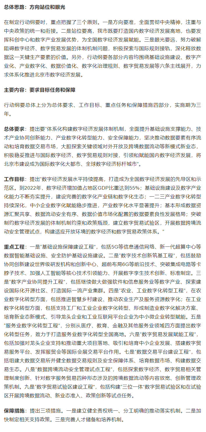 發揮北京市數字產業化和產業數字化優勢基礎,加快數字技術與經濟社會深度融合,進一步提升數字經濟發展水平和治理能力,將北京市打造成為我國數字經濟發展的先導區和示范區