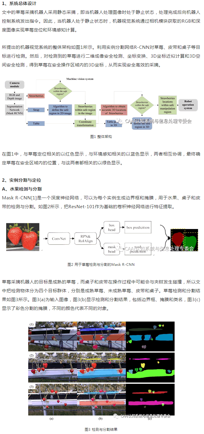 隨著農(nóng)業(yè)智能化發(fā)展,機(jī)器視覺(jué)越來(lái)越多的應(yīng)用于農(nóng)業(yè)之中。近期IEEE Access發(fā)表了“Fruit Localization and Environment Perception for Strawberry Harvesting Robots”,文中介紹了一種應(yīng)用于草莓采摘機(jī)器人的機(jī)器視覺(jué)系統(tǒng),可以實(shí)現(xiàn)草莓定位與環(huán)境感知。首先利用深度卷積神經(jīng)網(wǎng)絡(luò)對(duì)草莓進(jìn)行檢測(cè),然后通過(guò)坐標(biāo)變換、基于密度的聚類方法和位置逼近方法對(duì)草莓進(jìn)行局部定位。環(huán)境感知對(duì)于農(nóng)業(yè)機(jī)器人來(lái)說(shuō)至關(guān)重要,保證了機(jī)器人與人、目標(biāo)物體與周圍環(huán)境之間的安全交互。