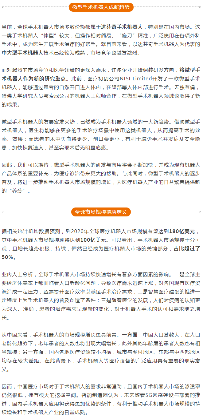 傳統(tǒng)的手術(shù)方式存在著準(zhǔn)確度、耗費(fèi)時(shí)長(zhǎng)、視野角度等多方面問(wèn)題,而手術(shù)機(jī)器人的應(yīng)用可以很好地解決上述難點(diǎn)。通過(guò)手術(shù)機(jī)器人來(lái)輔助進(jìn)行手術(shù),具有準(zhǔn)確度G、出血量少、創(chuàng)傷面小、恢復(fù)速度快等優(yōu)勢(shì),得到了醫(yī)生、患者