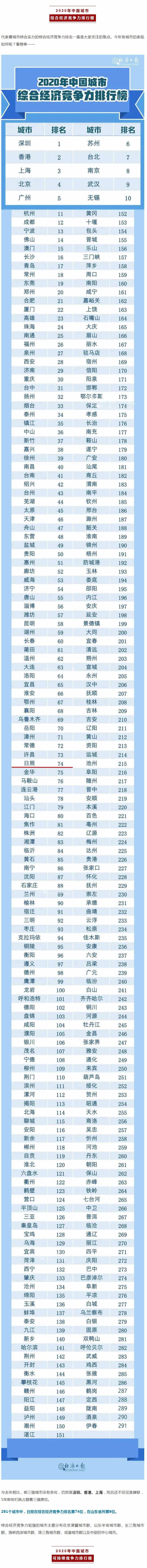 報告顯示,2020年城市綜合經(jīng)濟(jì)競爭力指數(shù)10強(qiáng)依次是:深圳、香港、上海、北京、廣州、蘇州、臺北、南京、武漢和無錫。2020年中國可持續(xù)競爭力指數(shù)10強(qiáng)依次是:香港、深圳、臺北、上海、北京、廣州、蘇州、南京、青島和武漢。