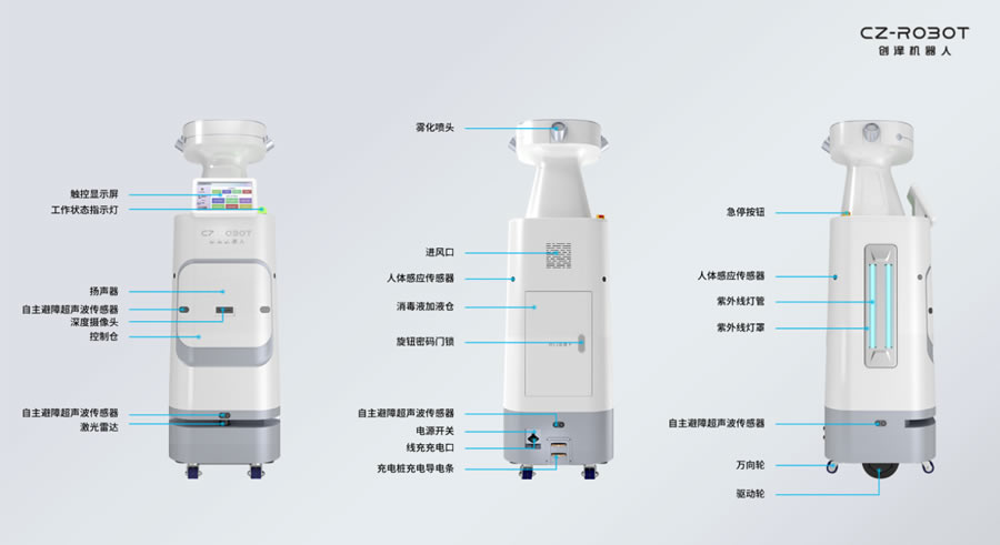 創(chuàng)澤消毒機器人擁有自主導(dǎo)航技術(shù),能夠根據(jù)設(shè)定的路線自主移動,滿足房間多或者布局復(fù)制的室內(nèi)環(huán)境下自動、定時、準(zhǔn)確的消毒需求。可實現(xiàn)等離子消毒、紫外線消毒、地面消毒等多模式智能消毒,配有“人機共存”和“無人消毒”兩種消毒模式,使消毒更具人性化。