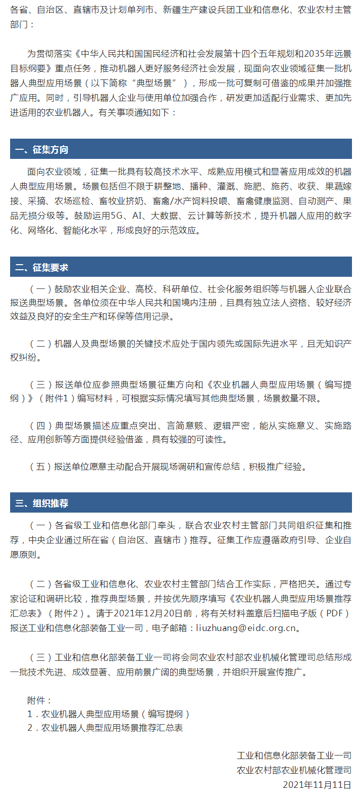 面向農業L域,征集一批具有較G技術水平、成熟應用模式和顯著應用成效的機器人典型應用場景。場景包括但不限于耕整地、播種、灌溉、施肥、施藥、收獲、果蔬嫁接、采摘、農場巡檢、畜牧業擠奶、畜禽/水產飼料投喂、畜禽健康監測、自動測產、果品無損分級等。鼓勵運用5G、AI、大數據、云計算等新技術,提升機器人應用的數字化、網絡化、智能化水平,形成良好的示范效應。
