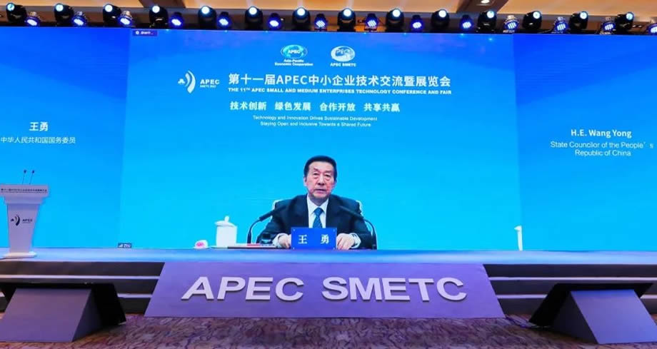 國務委員王勇在北京出席第十一屆APEC中小企業技術交流暨展覽會(下稱“技展會”)開幕式并發表視頻致辭,泰國副總理兼能源部部長蘇帕塔納蓬視頻致辭,工業和信息化部部長肖亞慶、國務院副秘書長王志清以視頻方式出席開幕式。工業和信息化部副部長徐曉蘭出席現場開幕式。