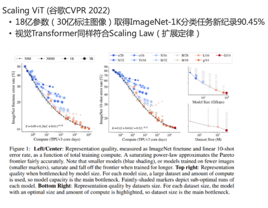 預訓練大模型是過去幾年AI發展主旋律,但是主要集中于自然語言處理L域。視覺L域 在2021年開始迎來進展。谷歌構建了一個擴展的ViT模型,擁有18億參數,并使用30億的 標注圖像進行訓練,在ImageNet上取得了新的記錄(90.45%)。這一工作還表明,在視覺L 域上,模型同樣符合Scaling Lawo即:模型越大、性能越好。