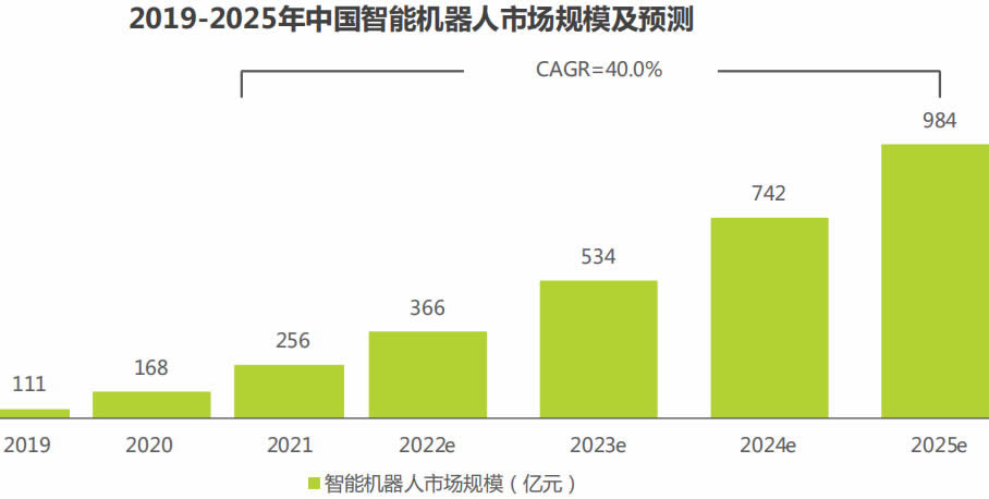 力及勞動(dòng)力的旺盛需求,整個(gè)機(jī)器人產(chǎn)業(yè)呈現(xiàn)健康走勢(shì)。艾瑞預(yù)測(cè),2025年中國智能機(jī)器人市場(chǎng)規(guī)模接近千億。相較于