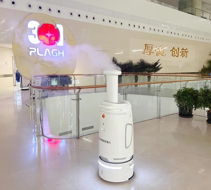 在中國(guó)人民解放軍總醫(yī)院D一醫(yī)學(xué)中心的門(mén)診大廳里,創(chuàng)澤智能消毒機(jī)器人頭D噴霧在醫(yī)院門(mén)診大廳走來(lái)走去進(jìn)行全域消毒殺菌,實(shí)現(xiàn)消毒效果量化管理
