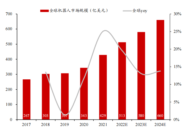 根據IFR、中國電子學會數據,預計機器人市場規模2024年有望達到660億美元,2020-2024年CAGR約18%。