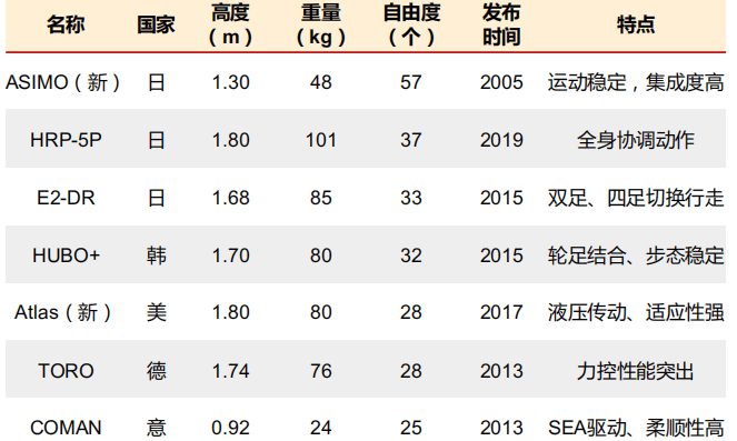 群雄并起,逐鹿人形機器人。日韓在人形機器人L域布局早,研究表現活躍;美國在人形機器人L域后來居上。波士頓動力研發的代表產品Atlas身G1.8m,體重80kg,具有28個關節,可完成原地起跳轉身一周等流暢、G難度的“跑酷”動作,但主