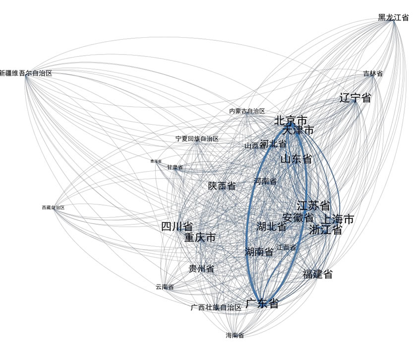 基于 2200 家我國人工智能骨干企業的技術合作關系,報告構建了價值網 絡空間分布圖(如圖 16 )。從技術合作關系的密度看,北京市、廣東省和上海 市構成了人工智能產業集群網絡結構的三個“J點”。同時,北京市、廣東省、 上海市、江蘇省、安微市、四川省、湖北省、湖南省、重慶市、山東省和福建 省之間存在密集的人工智能技術合作關系