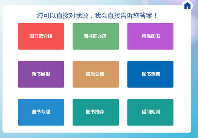 機器人屏幕主界面是分屏顯示,上部分展示各種媒體的入門(可點擊進入并操作),根據實際需求可設置圖書證辦理、圖書館介紹、精品圖書、信息公告、圖書查詢和借閱規則等導航圖標。